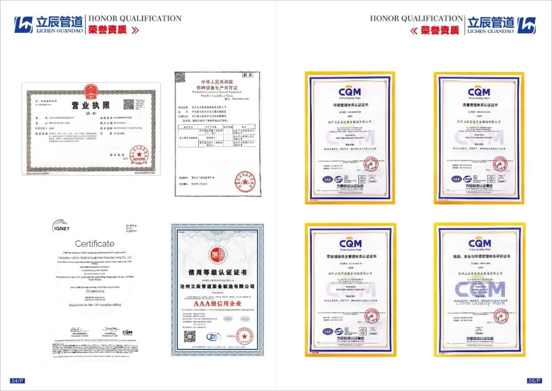 近年来公司获取了压力管道元件制造许可证,IS09001质量管理5体系认证、AAA级信用企业、重合同守信用企业、并与2022年被评为盐山县规上企业荣誉。公司凭借良好的信誉,完善的服务,充足的资源,在同行业树立良好的口碑。