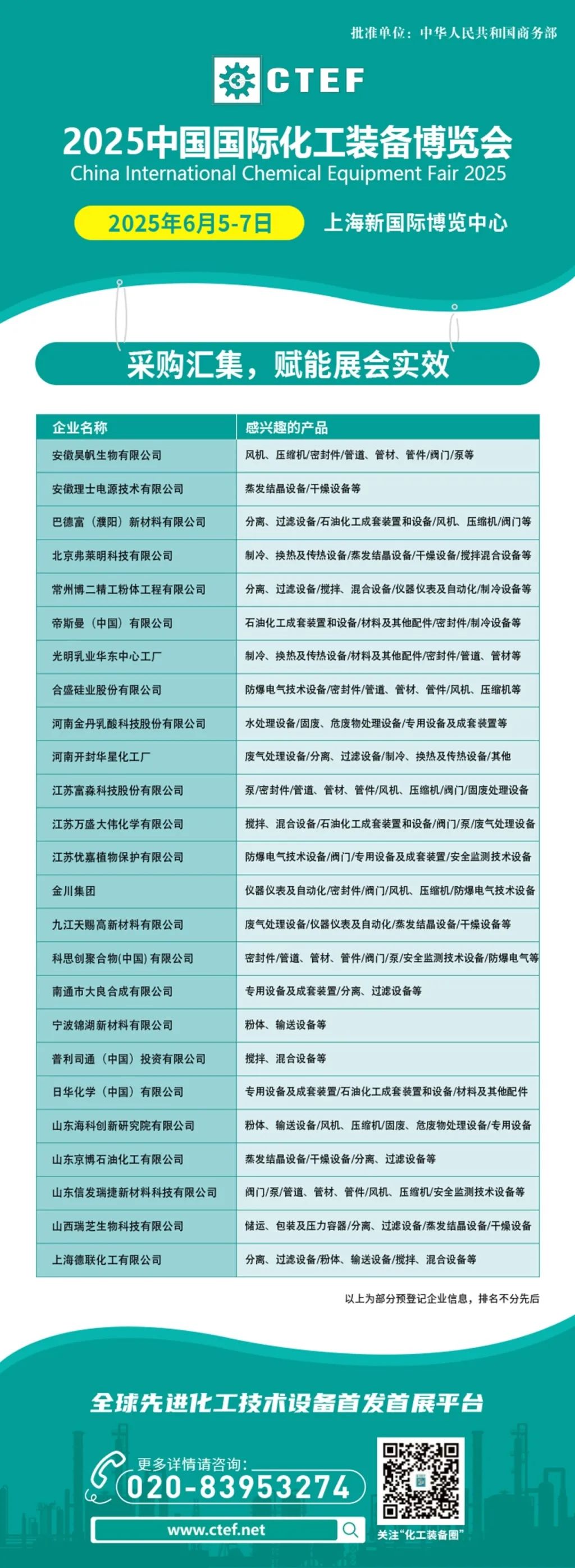 作为“化工装备圈”翘首以盼的年度巅峰盛会,每年的CTEF都能凭借强大的吸引力,引来众多海内外世界500强化工企业、行业龙头、化工园区、工程单位、用户单位等前来参观采购,下边,我们将陆续为大家“剧透”部分专业买家阵容,精彩不容错过!
